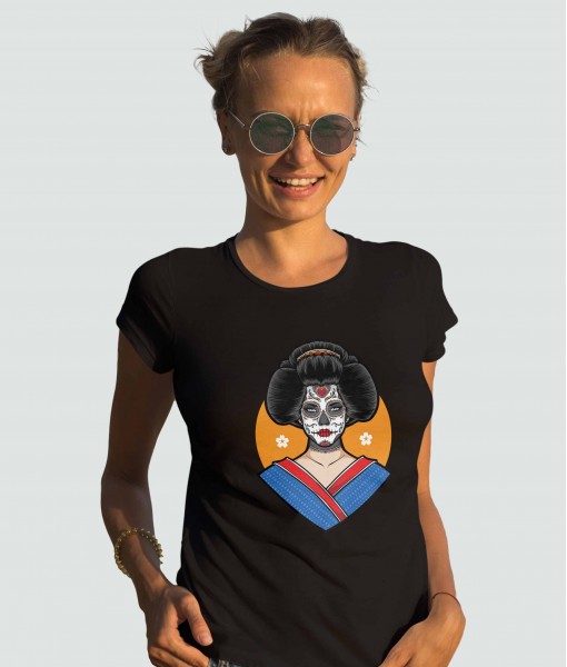 Дамска тениска с дизайнерска щампа - Илюстрация Арт Sugar skull geisha.Тениските, които предлагаме са изработени от вискокачествен памук и са с безкомпромисно качество, което гарантира дълъг живот без раздърпване.Материята на тениските е изключотелно мека на допир и удобна за носене. - Материя: 100% висококачествен памук (180 g / m²).- За да сте сигурни в избора на размер, сравнете Ваша тениска с размерите посочени в таблицата по-долу...